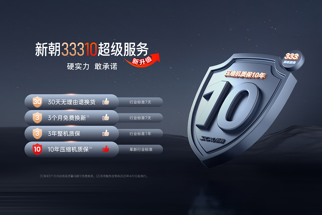 2025年,SICAO新朝服务体系焕新升级,再次引领传统家电行业服务标准。“33310超级服务”所承诺的压缩机10年质保,并不是一句更好听的口号,而是我们对产品质量的自信。