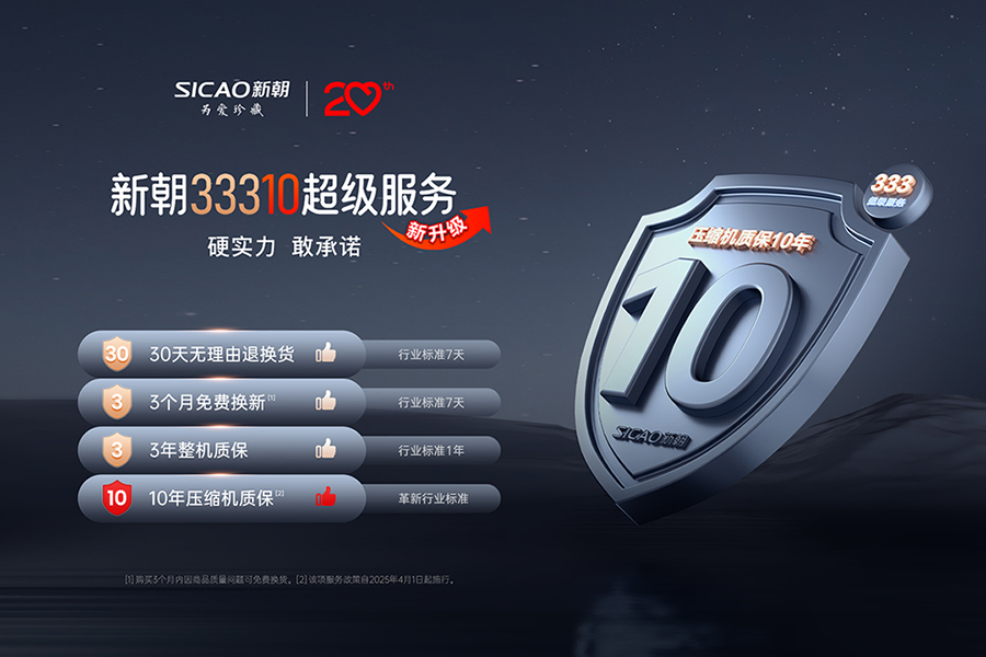 为了让技术创新真正转化为使用体验,SICAO新朝同步建立“33310”服务体系,以“30天无理由退换货、3个月免费换新、3年整机质保、10年压缩机质保”的承诺,以数百个城市的数百个专业网点为依托,确保24小时内响应需求,48小时内出具有效解决方案,为用户带来超越行业标准的保障。